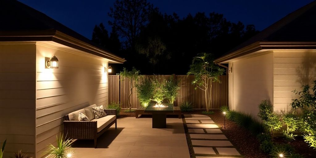 Lighting embedded in paving, steps, or vertical posts to unify patio and garden after dark